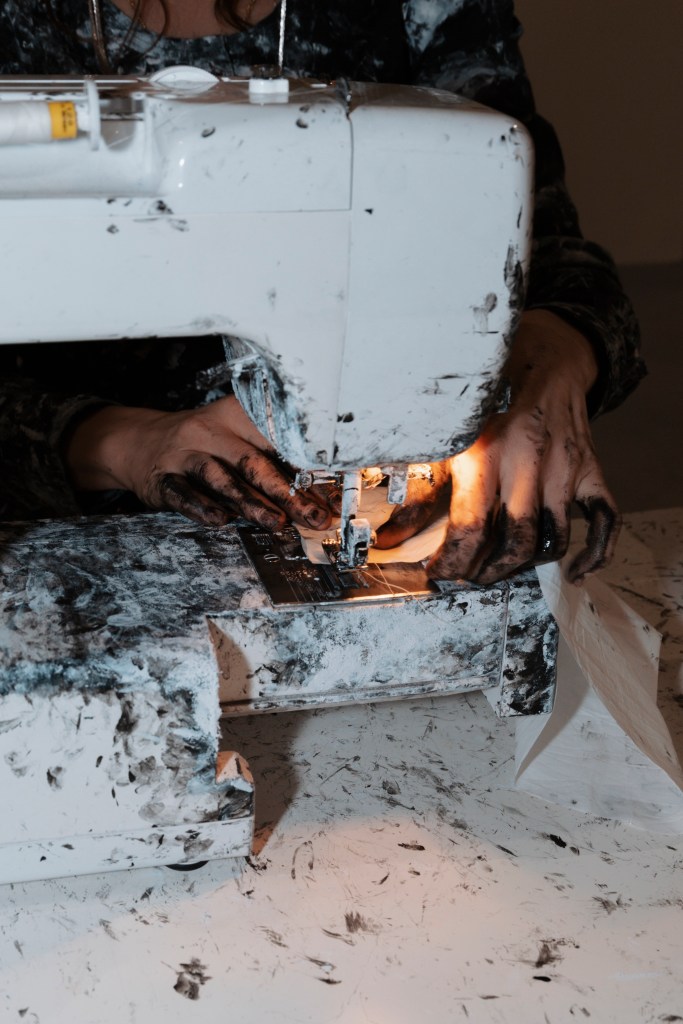 The paint-sewing performances came from the idea that the process is quite striking to look at and draws people in. So it was originally a small extra I did at some pop-ups and some art and design festivals. Then, from a business perspective, it’s a way to continue to work and expand the project, beyond being so product-focused. So it’s still in this fashion world, but it’s not like we have to make and sell physical products. The performance is another way to spread this, and that was something we were interested in.