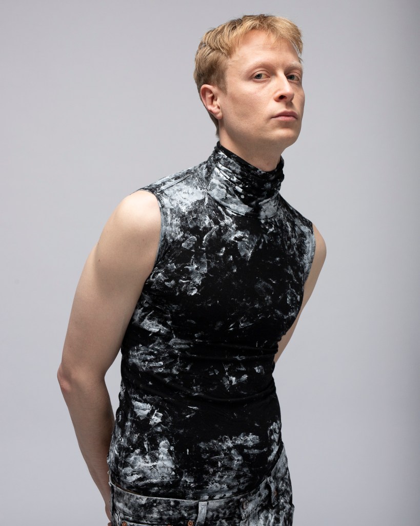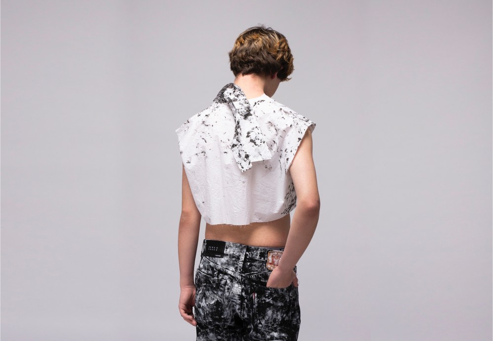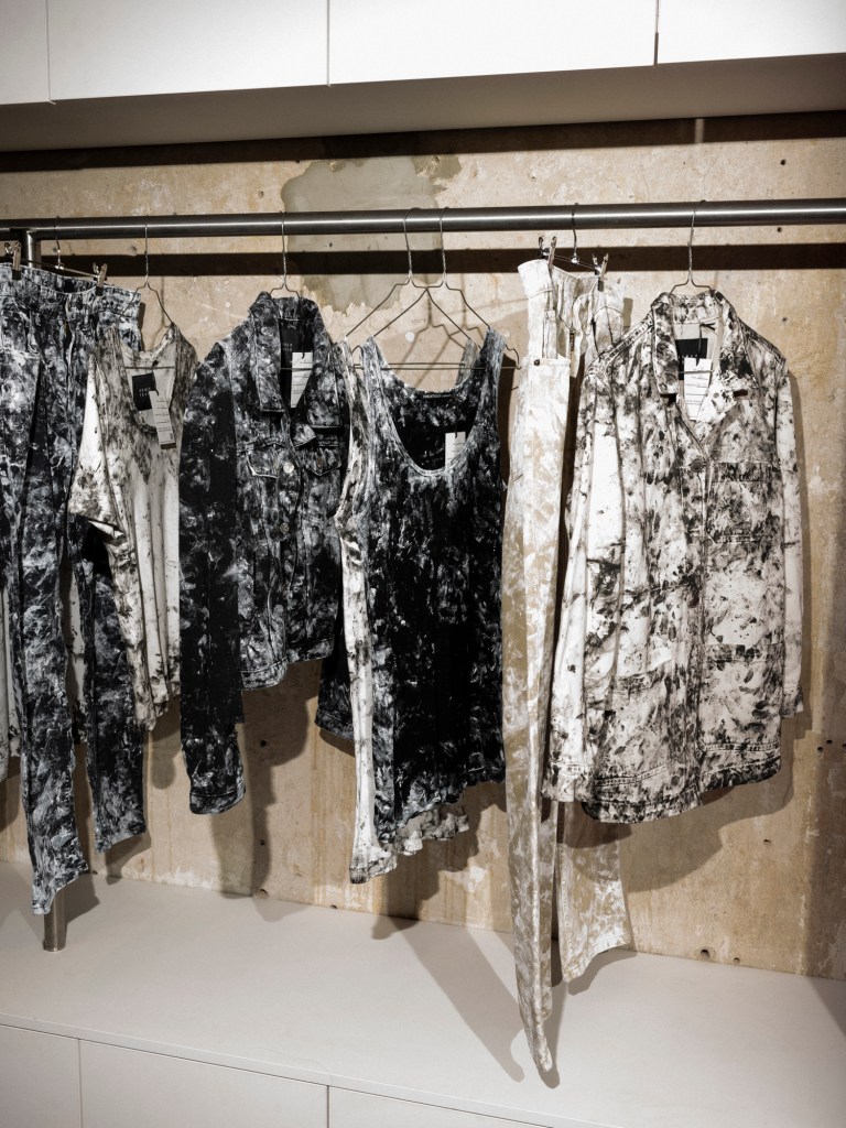 The starting point for the choice of styles, silhouettes, and products was to use everyday products that are everywhere around us, like a simple pair of denim jeans, a menswear shirt, or just a T-shirt. We ventured a bit into beige tones and blue jeans, again, more classic wardrobe staple items. Then, here and there, we sprinkle in special pieces that are maybe a bit more experimentally fitted, more drapey, or unusual. The idea is to keep the silhouette simple because the paint design is quite messy, so we need the product to still be legible.