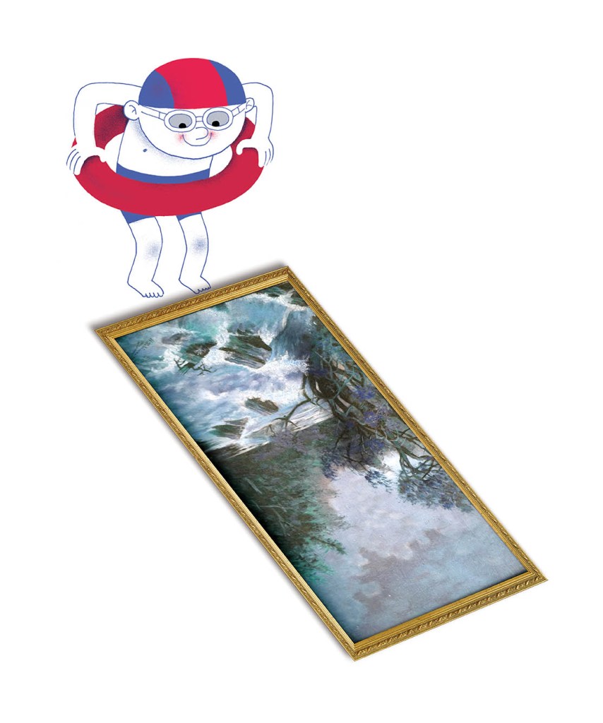 I deliberately worked out and combined two styles. ROSA is worked out more plastically and detailed, like the painting she jumps in and out of, whereas the illustrations through which she swims are digitally evenly colored and drawn a little more loosely.