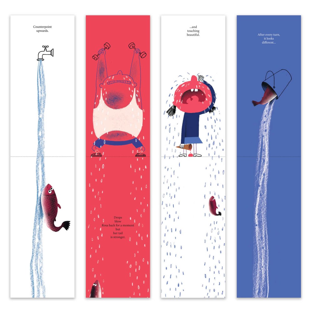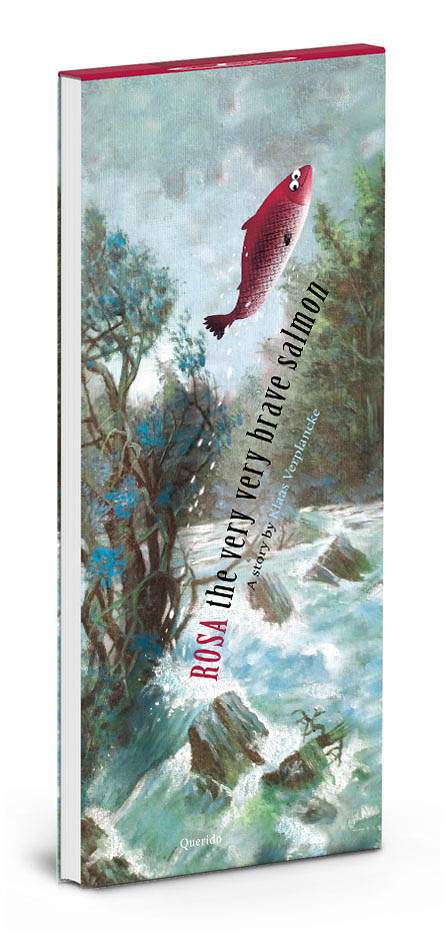 What is long, narrow and folds open from the top? It is ROSA: The Very Brave Salmon, a new book by Klaas Verplancke, in which a wild pink fish braves wild, rushing brooks, and is to be expected to start spawning. But also, in her existential quest, ROSA travels any way possible using human means, such as fire hose, child’s tears and watering can to reach her destination. All this so she can, at the end (and this is not a spoiler: she will die a salmon’s ritual death). Verplancke’s tale is one of endurance, courage, and the power of behavior in nature. Klaas offers more on his fishy tale below.