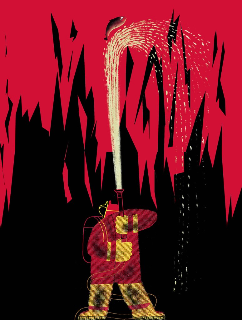 My illustrations are almost systematically meaningful juxtapositions. Salmon only swim up rivers. Exchanging the river for a spouting fire hose or a waterfall of sweat drops is not only visually funny and intriguing, but it is also a conflict that triggers my mind. After all, creativity emerges only from friction.