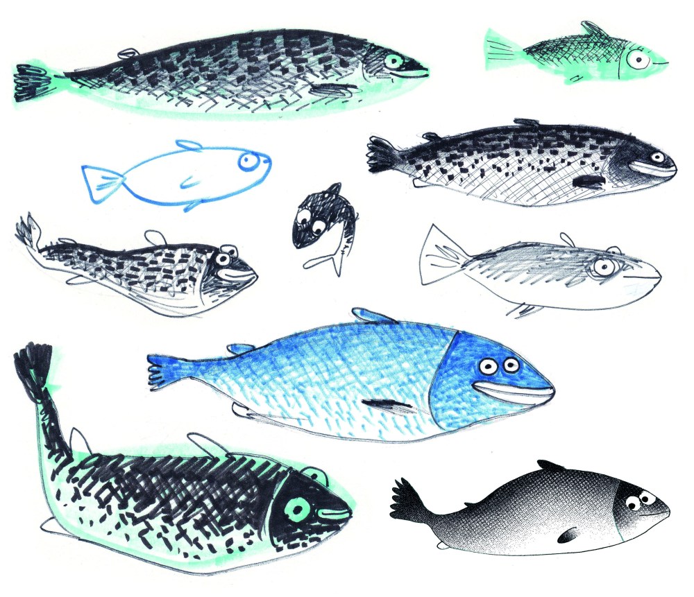 The biggest difference from the original manuscript was that the salmon turned from an anonymous fish into Rosa, a character, with thoughts and feelings. This elaboration is where I ended up putting most of my energy. A fish’s body language is fairly limited. So it was quite a job to get enough movement and variation in ROSA’s movement and facial expressions. It helped me a lot to see a documentary about migrating animals, with the legendary Sir Richard Attenborough as the voice-over. I learned that salmon turn red when they start their final journey. That color inspired me for the naming, and it helped me to make Rosa stand out, even in a small size, in every picture.