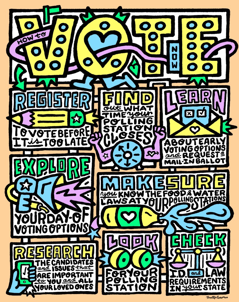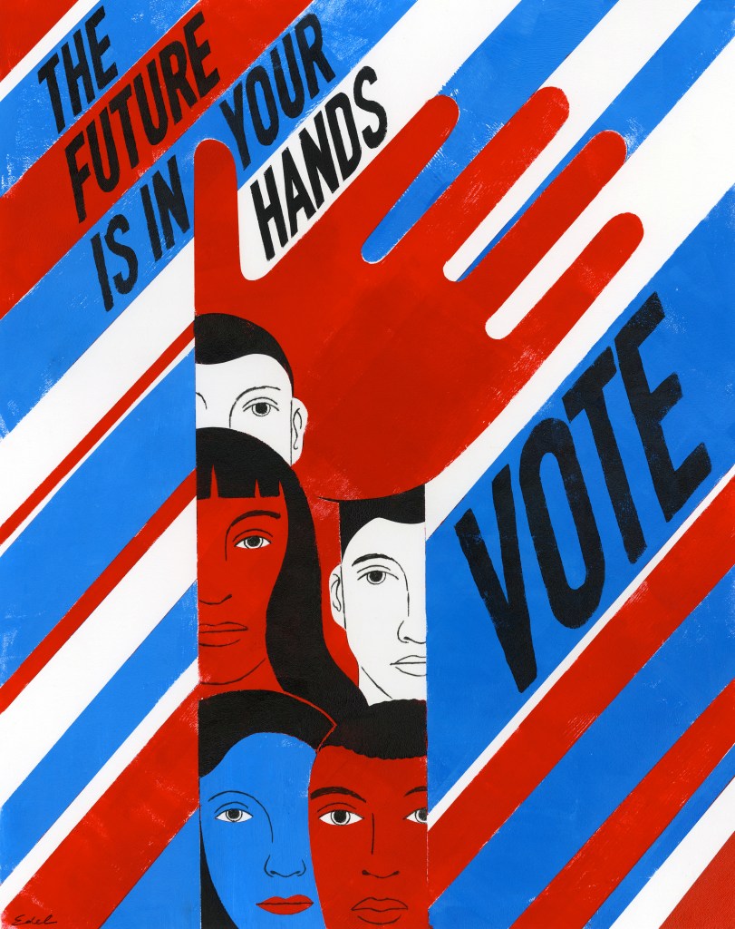 The Norman Rockwell Museum has launched The Unity Project 2024, a poster campaign to motivate people to vote. Distributed primarily through social media, the campaign features striking images and messages from six top contemporary illustrators who reach a wide range of audiences: Monica Ahanonu, Lisk Feng, Timothy Goodman (above), Edel Rodriguez, Gary Taxali and Shar Tui’asoa/Punky Aloha.