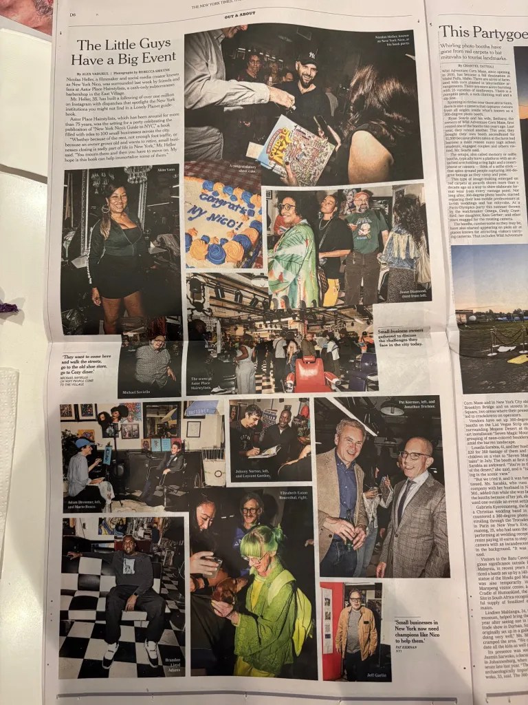 Left: Nicolas Heller; Right: a recent feature in The New York Times covering a book launch event at Astor Place Hairstylists, one of the institutions featured in the book