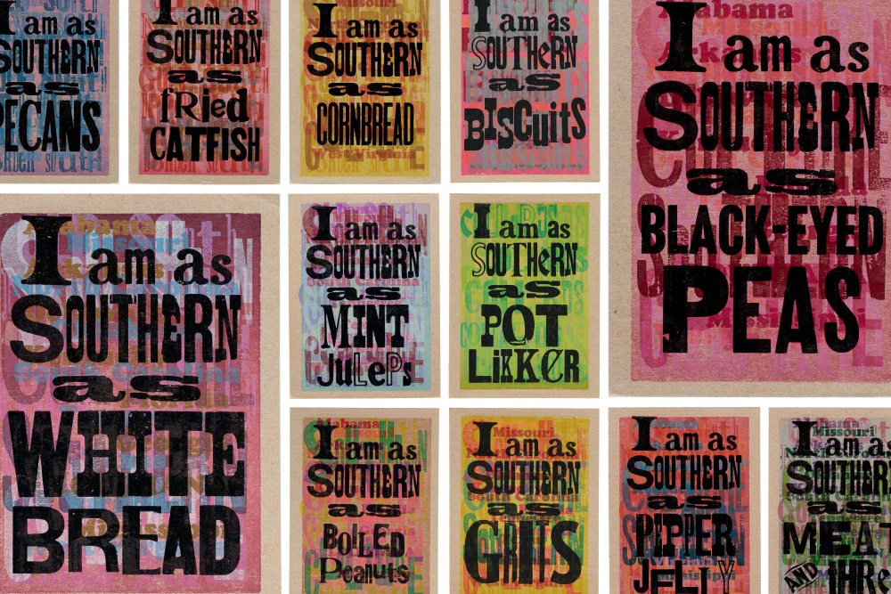 I was formally trained in what they call fine printing and book arts, but when I moved to Alabama, I transitioned to what I’m doing now. The reason I do what I do is out of necessity. I had a commission that I was working on, and I made a mistake, but I didn’t have any more paper, and I didn’t have money to buy it, so I had to do something with what I had. I decided to carefully print another layer over everything so you couldn’t see the mistake and put the corrected text on top. After I did that, I found it interesting how the letters overlapped in the shapes that were made, so I continued doing that. It became one of the styles that people recognize me for.