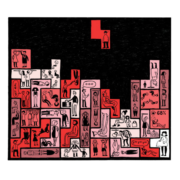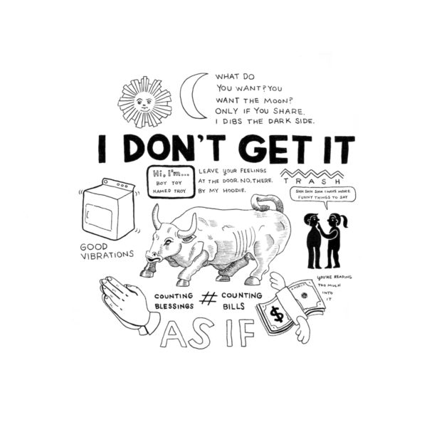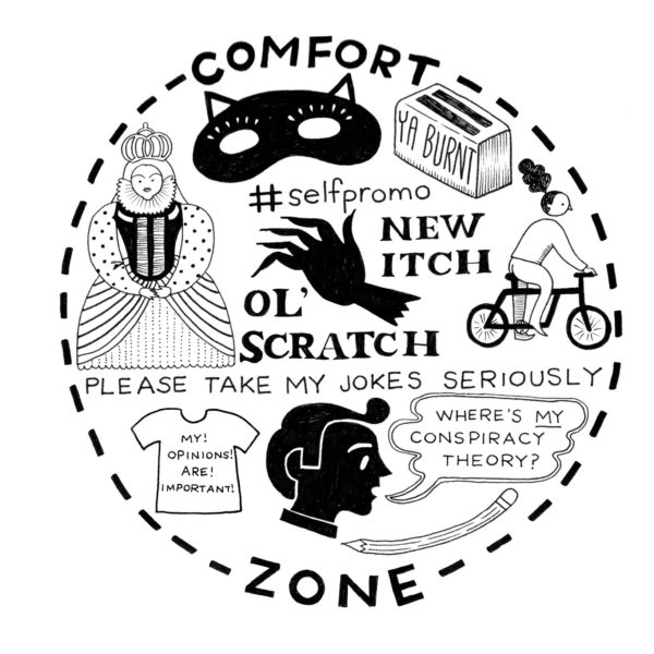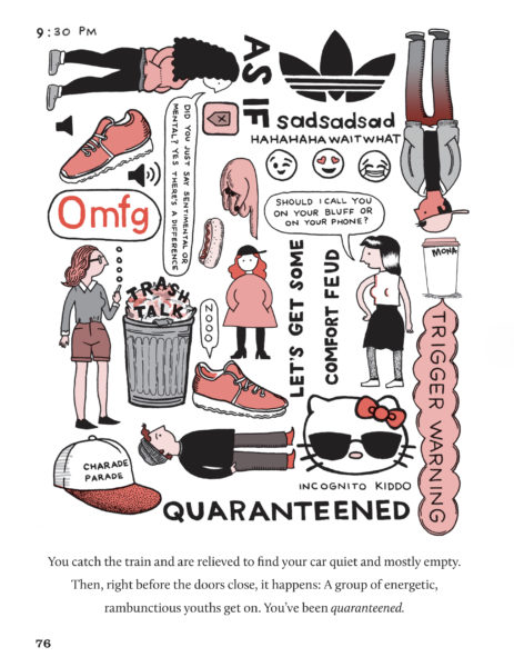 Work of which you’re most proud: I’m most proud of my new book, In a Daze Work, which came out in July from TarcherPerigee, an imprint of Penguin Random House. It is an illustrated choose-your-own-adventure book for adults that goes through the span of an average day, and focuses on the humor in the little things in life (often through observational illustrated puns). Since this was my first book, I really tried to make the most of each page and experimented with methods of visualizing a narrative. I wrote, designed and illustrated the whole thing, so this is the most “me” project I’ve ever done. Working on this, it felt like I collected every mundane thing I experience in a day, what my thoughts are during those moments, and put it all together to share with the world, like, Here’s how my mind works—does it make sense to you? This is how I am—maybe this is like you, too? It feels very satisfying to pull from my own life and illustrate memories in a way others can relate to and find funny. Sometimes I need to remind myself that I’m not alone and others are dealing with the same things I am.