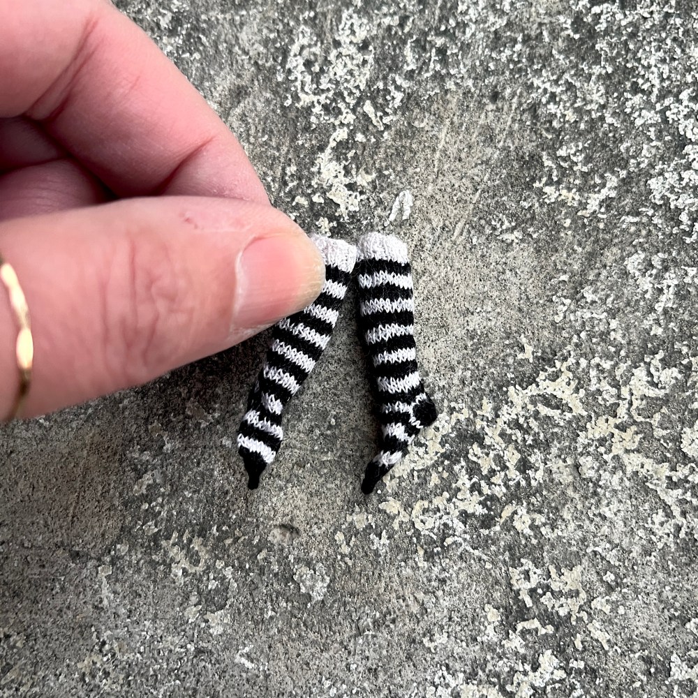 Right now, I’m working on a series, “iconic knits in miniature,” and for that, I’m looking specifically for pieces of knitting that tell broader cultural stories. I’m making miniature patterns of items from pop culture, film, and fashion history—many of them are popularly recognizable like the Princess Diana “Black Sheep Sweater” or the Pendleton sweater that The Dude character wears in the movie The Big Lebowski, or the striped socks the Wicked Witch of the East is wearing when the house falls on her in The Wizard of Oz.