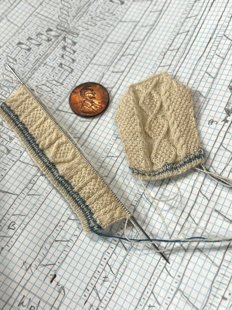 My other favorite is the Princess Diana sweater, designed by Sally Muir and Joanna Osborne because it’s a fun design. The first draft made me giggle the whole way through because the sheep are funny, it felt wonderful to make it, and I knew that people would recognize it. But I still wasn’t prepared for how deeply it resonated with the public: my miniature version now belongs to the KSB Miniatures Collection in Kentucky, in the Spencer house, the dollhouse recreation of the childhood home of Lady Diana Spencer.