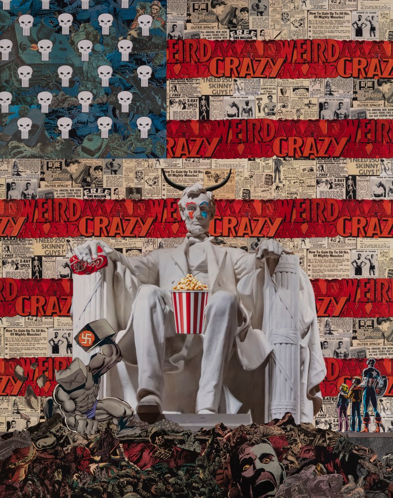 This is part of a larger project that will culminate in a major show, Rebirth of a Nation, in London from March 24 to April 10, 2025, including a depiction of Abraham Lincoln’s statue against the riotous backdrop of contemporary American iconography, among other reimagined icons and memes.