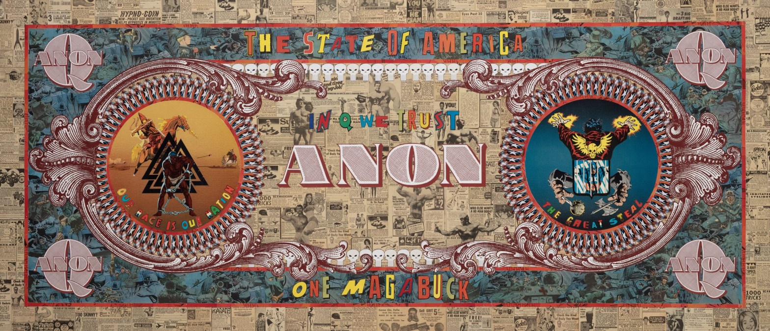 To represent the Dollar Bill as a prophecy of doom, Q forewarned of an apocalyptic fallout by using pop cultural elements: the Punisher heads brandished by right-wing Patriots’ Prayer, comic superhero shields waved by Proud Boys at MAGA rallies.