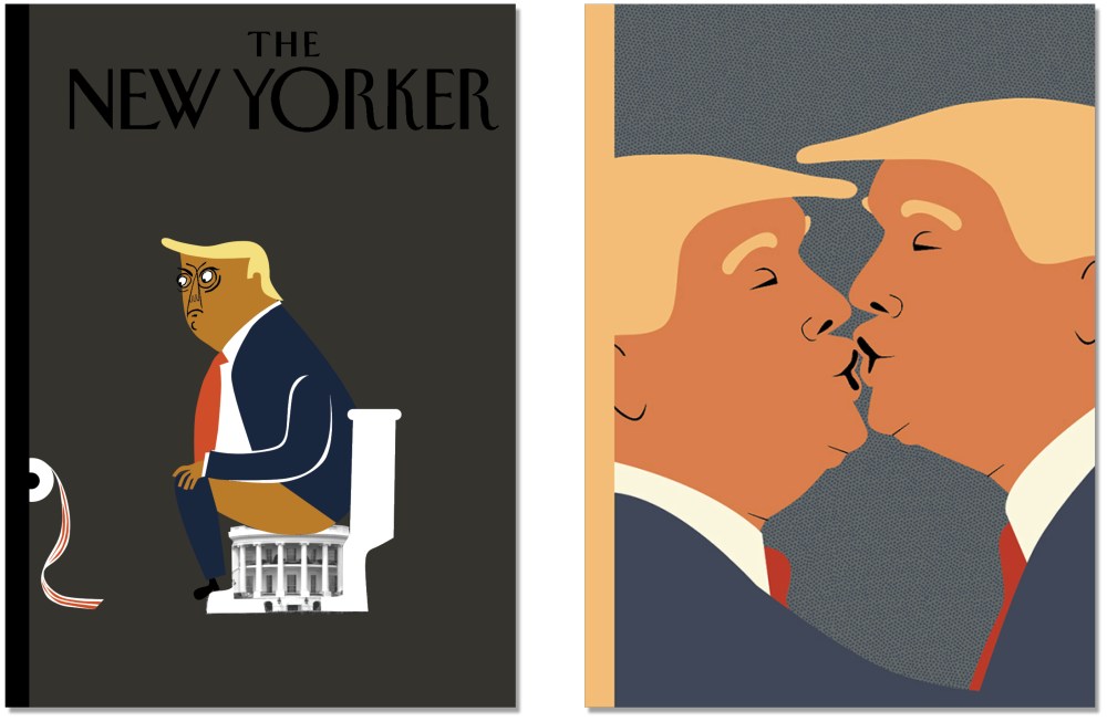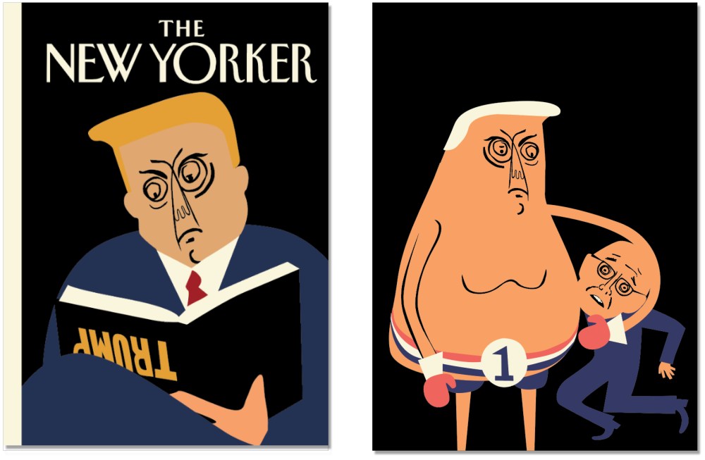 Creating effective satiric art is not easy. There are often a handful of tropes in circulation, and the urge to employ them for reasons of widespread association leads to some cliched imagery. Some political satiric illustrators and cartoonists “got it,” and others do not meet the standards of, say Edel Rodriguez or Barry Blitt. But for an artist to keep trying shows a tenacity that may pay with a memorable image, which is what it is all about—a metaphoric or realistic picture, like Thomas Nast’s Tammany Hall moneybags, that is forever a reminder of Boss Tweed’s corruption.
