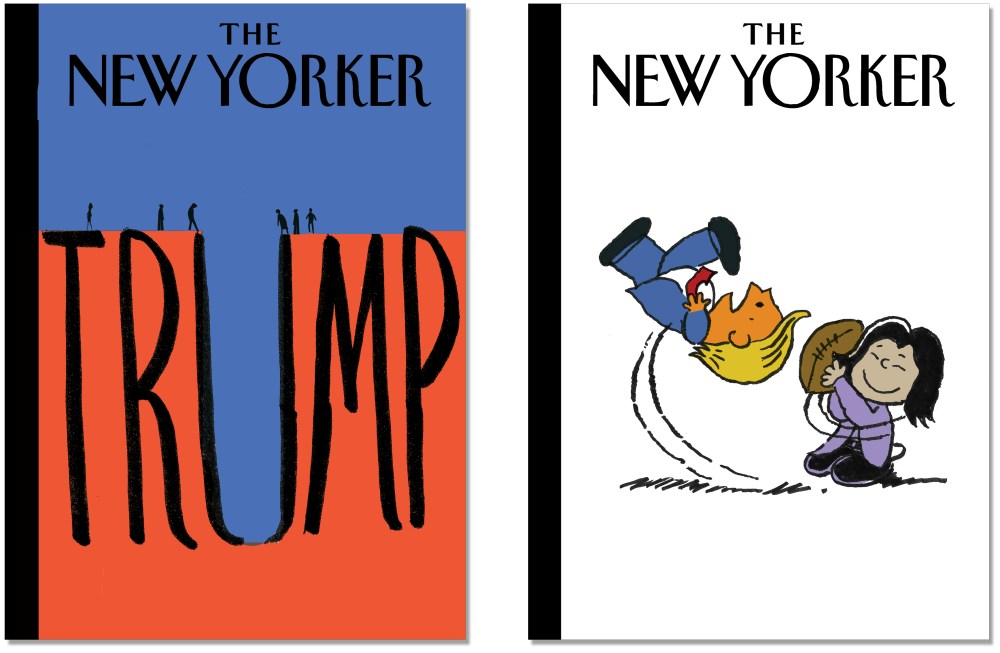 Perhaps the best typographic sketch is the one with the central ‘U’ in “TRUMP” used to represent a chasm dividing the nation. The most promising reaction I received was the Charlie Brown and Lucy football cover, pitched shortly after Kamala entered the race and was seemingly doing better in the polls than Trump.